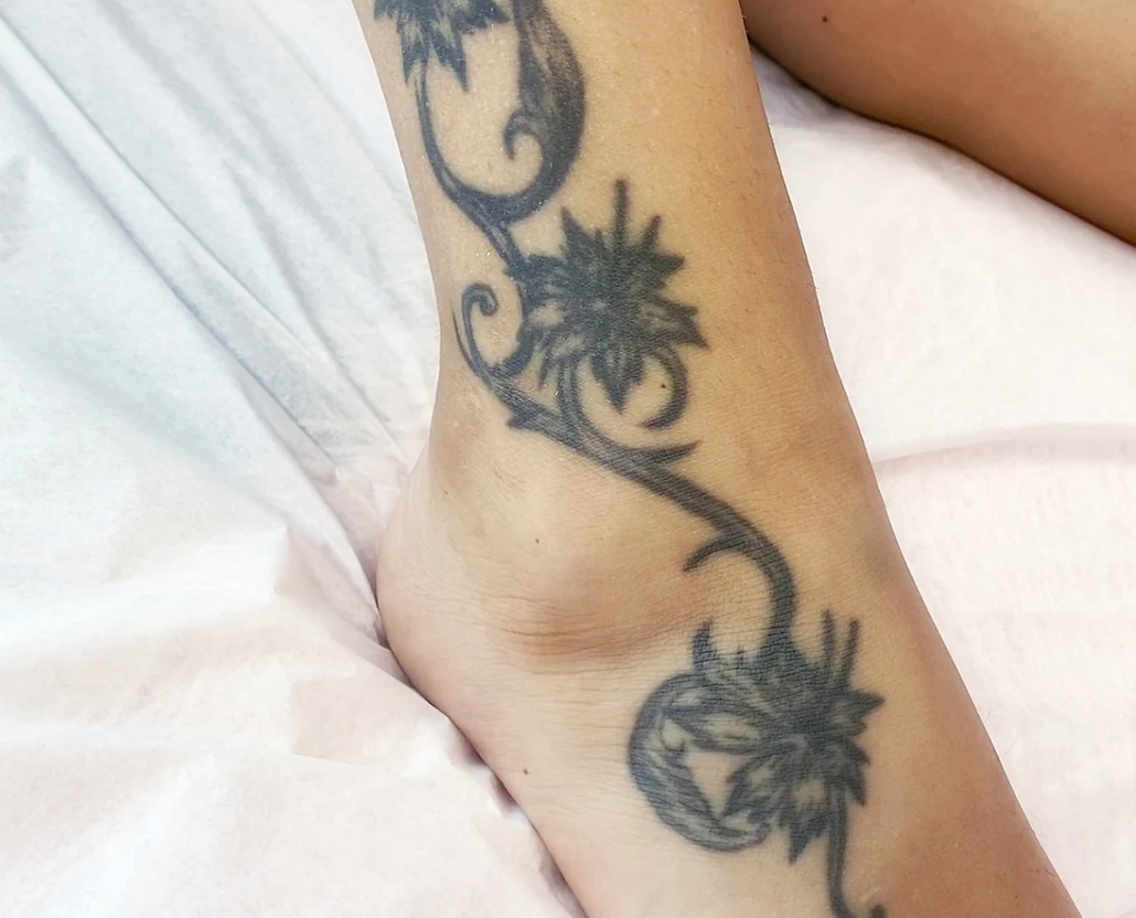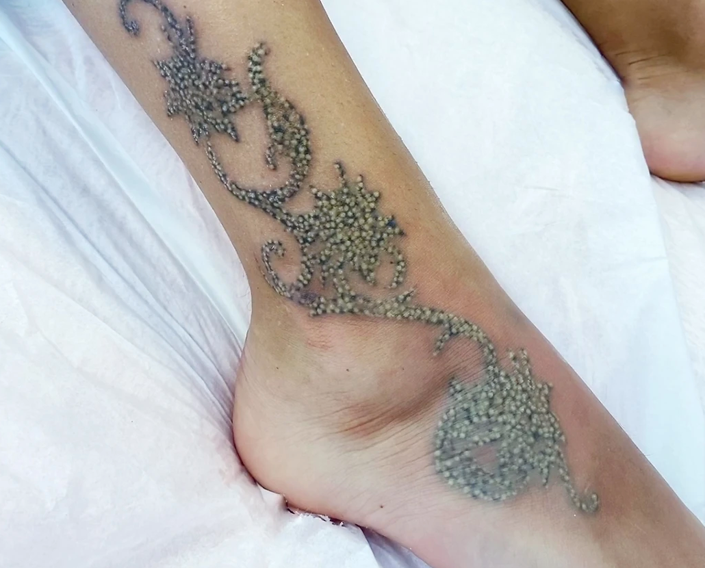 The laser pulsed light is passed over the tattoo to absorb pigments.